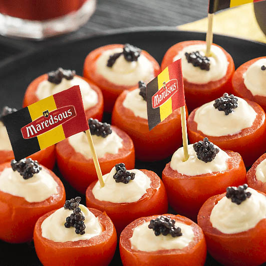 Pour 4 personnes : 250g de tomates cerise 1 barquette Maredsous® Double Crème 80g d’oeufs de lompe