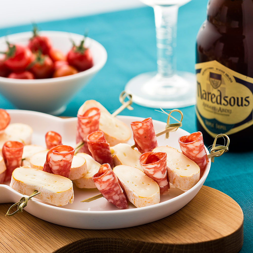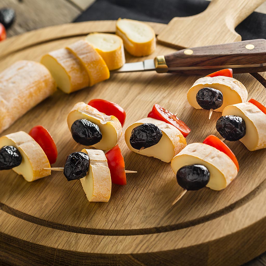 Pour 4 personnes : Une buchette de Maredsous® Fagotin Tradition 250g de tomates cerise 100g d’olives noires Une dizaine de cure-dents
