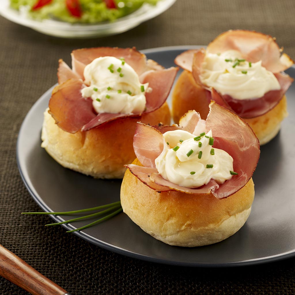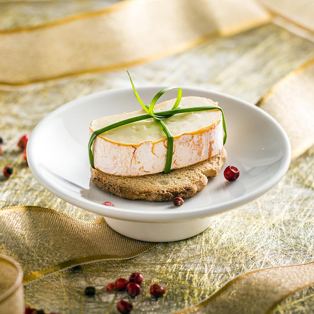 Pour 4 personnes : 4 portions de Maredsous® Double Crème 8 mini tartines au lait 100g de speck 5 tiges de ciboulette