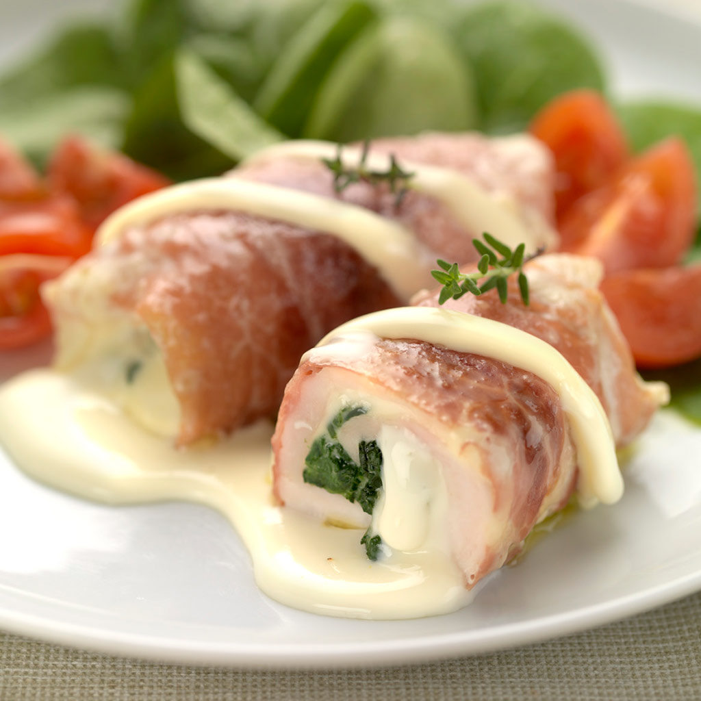Pour 4 personnes : 8 portions ou 150g de Maredsous® Jambon 8 tranches de blanc de poulet 8 tranches de jambon cru 200g d’épinards