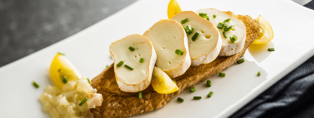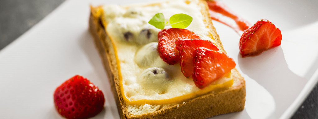 Pour 4 personnes : 4 tranches de Maredsous® Tradition 4 tranches de pain de mie blanc 450 g de fraises fraîches 2 œufs 300 ml de lait Canneberges Lemon cress (cresson citronné)