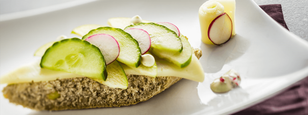 Pour 4 personnes : 4 tranches de Maredsous® Light 4 morceaux de baguette aux noix 1 concombre 4 radis 2 pommes Granny Smith 150 ml de crème fraîche allégée 1 jaune d’œuf Moutarde et aneth