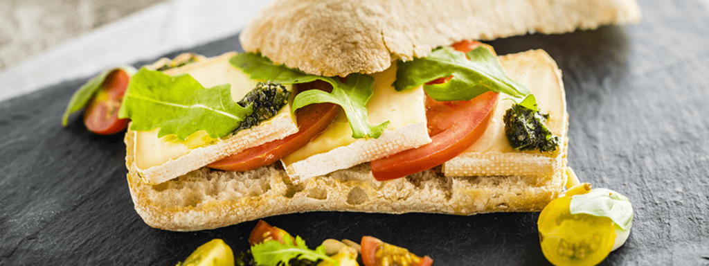Pour 4 personnes : 250 g de Maredsous® Tradition en bloc 4 petits pains de type ciabatta 4 gousses d’ail 1 plant de basilic 4 tomates 8 tomates cerises (jaunes ou rouges) 100 g de parmesan 200 ml d’huile d’olive Roquette, pignons de pin et lait