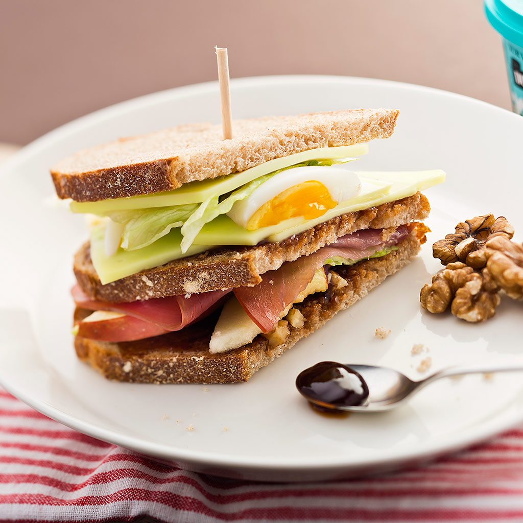 Pour 1 personne : tranche de Maredsous® Caractère tranche de noix de jambon d’Ardenne Marcassou 3 tranches de pain de campagne Du sirop de Liège 1 demi-pomme Jonagold coupée en fines lamelles 1 demi-œuf dur Quelques noix 2 feuilles de salade Iceberg