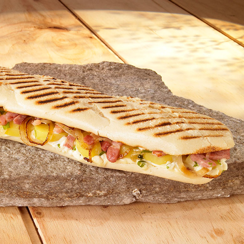 Pour 1 personne : 25 g ou 1 portion de fromage fondu Maredsous® Double Crème 1 baguette blanche non cuite, type panini 4 à 5 tranches de pommes de terre 2 oignons finement ciselés 160 g de lardons