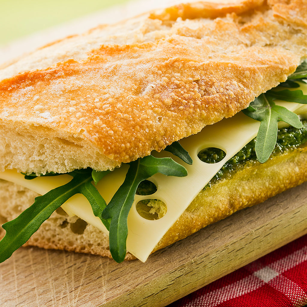 Pour 1 personne : 2 tranches de fromage en tranches Maredsous® Sensation 1 mini-baguette 1 cuillère à soupe de pesto Quelques feuilles de roquette