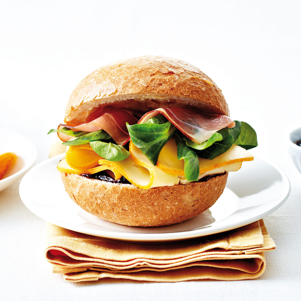 Pour 1 personne : 1 pistolet 1 tranche de Maredsous® Tradition 1 cuillère à soupe de sirop de Liège 1 feuille de salade 1 tranche de jambon d’Ardennes Marcassou