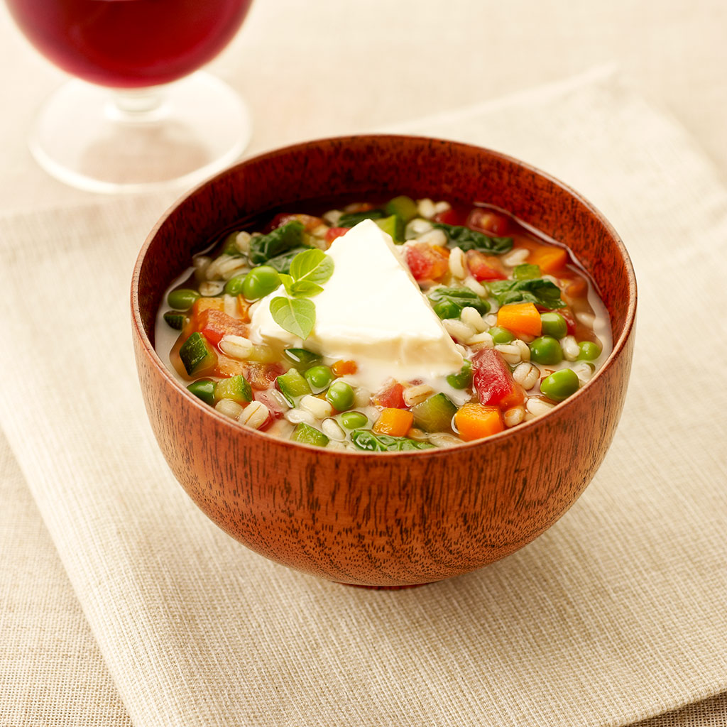 Pour 4 personnes : 4 portions de Maredsous® Light 200 g d’orge 1L de bouillon végétal 1 carotte 1 courgette 1 tomate 200 g de petits pois 100 g d’épinards 4 feuilles de basilic